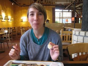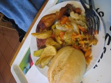 Anyway, we got food from the buffet. Its quality was comparable to, say, attending a modestly provisioned German middle class wedding. Ann's chicken leg was the best part. Here she is enjoying it: